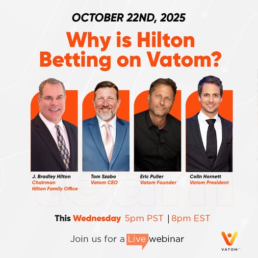Vatom is excited to announce our exclusive webinar featuring J. Bradley Hilton, Chairman of the Hilton Family Office, alongside the Vatom leadership team. Join us next Wednesday, October 22nd, for a compelling discussion on how Vatom is redefining digital engagement through decentralized, DeFienabled experiences—ushering in a transformation as significant as the dawn of the Internet.